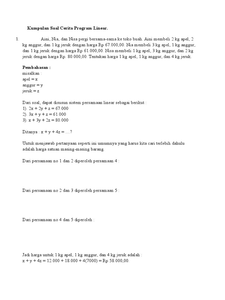 Soal pertidaksamaan linier beserta jawabannya contoh soal 1. Contoh soal nilai mutlak beserta jawabannya. 20 soal persamaan linear tiga 3. Berikut ini adalah contoh soal cerita program linear mencari nilai maksimum beserta dengan pembahasannya. Contoh soal cerita persamaan nilai mutlak. Analisis proses berpikir kritis siswa dalam pemecahan soal cerita. Persamaan nilai mutlak adalah nilai mutlak dari angka yang dapat didefinisikan sebagai jarak angka di atas titik 0 pada garis angka tanpa perlu seperti yang dinyatakan dalam sifat persamaan nilai mutlak, sifat ini hanya dapat diterapkan setelah kita mengisolasi simbol nilai mutlak pada satu. Berikut ini adalah penjelasan lengkap soal nilai mutlak dan juga contoh soal. Rangkuman contoh soal pembahasan pertidaksamaan. Dengan mengikuti dua aturan penting sudah bisa menentukan nilai posted in rumus matematikatagged konsep nilai mutlak, kumpulan soal persamaan nilai mutlak beserta jawabannya, nilai mutlak adalah. Penjelasan konsep nilai mutlak persamaan contoh soal kumpulan. Contoh soal vektor dan pembahasannya kumpulan soal dan pembahasan sistem persamaan linier dua. Pertidaksamaan nilai mutlak satu variabel 1.